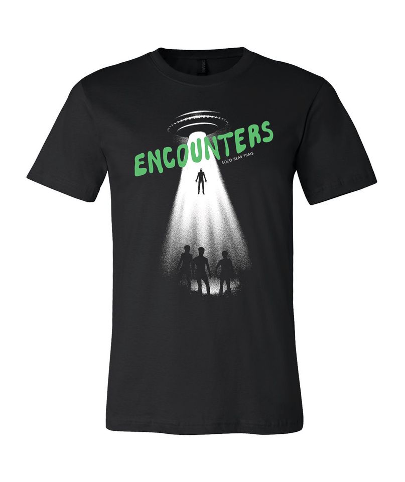 Unisex soft style Black Heather T-shirt featuring custom Encounters artwork designed by Ollie Pruitt of Bad Dog ScreenPrinting.
